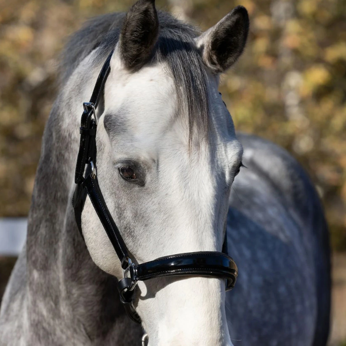 Designed to match our best seller Celebrity bridle, this halter is made of black patent leather, lined with plush black nappa leather padding, and elevated with a subtle, tone on tone, black sparkle piping on the noseband. Simply stunning and incredibly unique!
