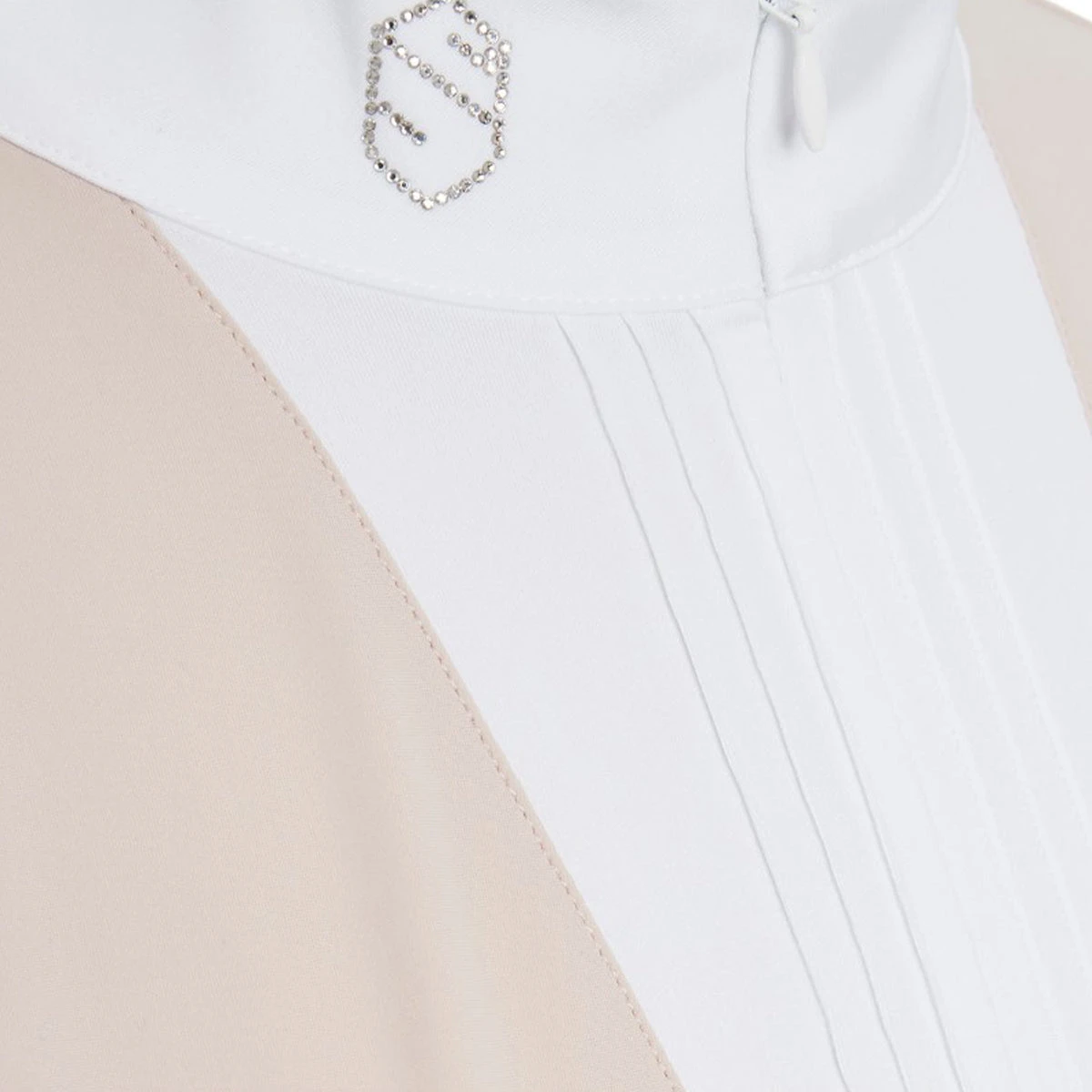 The Womens Clarisse Short Sleeve Show Shirt features a thin pleated bib, shaped perfectly to sit in line with the competition jacket. An invisible zipper gives ease of use to the wearer, whilst the Swarovski Samshield blazon on the collar and delicate teardrop opening on the reverse add to the feminine feel of this garment. The material is a high stretch, breathable, technological fabric that wicks away sweat to keep the rider dry and comfortable and UV protection maintains the quality of the fabric and protects the riders skin in the summer months. Easy care, machine washable at 30’C and made in an eco conscientious manner.